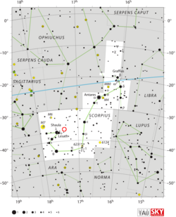 NGC 6334, colloquially known as the Cat's Paw Nebula, Bear Claw Nebula, or Gum 64, is an emission nebula and star-forming region located in the constellation Scorpius.[4] NGC 6334 was discovered by astronomer John Herschel in 1837, who observed it from the Cape of Good Hope in South Africa .[5] The nebula is located in the Carina–Sagittarius Arm of the Milky Way,[6] at a distance of approximately 5.5 kilolight-years from the Sun.[7]