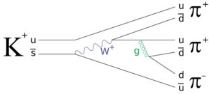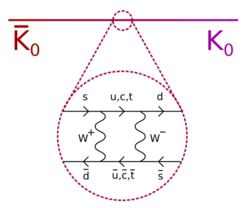 Since neutral kaons carry strangeness, they cannot be their own antiparticles. There must be then two different neutral kaons, differing by two units of strangeness. The question was then how to establish the presence of these two mesons. The solution used a phenomenon called neutral particle oscillations, by which these two kinds of mesons can turn from one into another through the weak interactions, which cause them to decay into pions (see the adjacent figure).