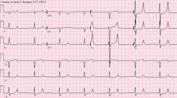 A 12-lead ECG of a person with CKD and a severe electrolyte imbalance: hyperkalemia (7.4 mmol/L) with hypocalcemia (1.6 mmol/L). The T-waves are peaked and the QT interval is prolonged.