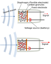 In 1876, Edison began work to improve the microphone for telephones by developing a carbon microphone, which consists of two metal plates separated by granules of carbon that would change resistance with the pressure of sound waves.[12]: 132–141