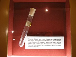Edison's last breath is kept, as a memento, in a test tube at The Henry Ford museum near Detroit. Charles Edison had the test tube prepared and sent to Ford as a symbol of his father's love of chemistry and friendship with Ford.[147] A plaster death mask and casts of Edison's hands were also made.[148]
