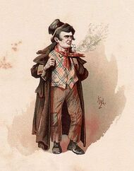 His characters were often so memorable that they took on a life of their own outside his books. "Gamp" became a slang expression for an umbrella from the character Mrs Gamp, and "Pickwickian", "Pecksniffian" and "Gradgrind" all entered dictionaries due to Dickens's original portraits of such characters who were, respectively, quixotic, hypocritical and vapidly factual. The character that made Dickens famous, Sam Weller became known for his Wellerisms—one-liners that turned proverbs on their heads.[49] Many were drawn from real life: Mrs Nickleby is based on his mother, although she did not recognise herself in the portrait,[185] just as Mr Micawber is constructed from aspects of his father's 'rhetorical exuberance';[186] Harold Skimpole in Bleak House is based on James Henry Leigh Hunt; his wife's dwarfish chiropodist recognised herself in Miss Mowcher in David Copperfield.[187][188] Perhaps Dickens's impressions on his meeting with Hans Christian Andersen informed the delineation of Uriah Heep (a term synonymous with sycophant).[189]
