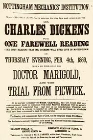 After separating from Catherine,[125] Dickens undertook a series of popular and remunerative reading tours which, together with his journalism, were to absorb most of his creative energies for the next decade, in which he was to write only two novels.[126] His first reading tour, lasting from April 1858 to February 1859, consisted of 129 appearances in 49 towns throughout England, Scotland and Ireland.[127] Dickens's continued fascination with the theatrical world was written into the theatre scenes in Nicholas Nickleby, and he found an outlet in public readings. In 1866, he undertook a series of public readings in England and Scotland, with more the following year in England and Ireland.[128]