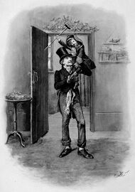 Dickens made rapid progress both professionally and socially. He began a friendship with William Harrison Ainsworth, the author of the highwayman novel Rookwood (1834), whose bachelor salon in Harrow Road had become the meeting place for a set that included Daniel Maclise, Benjamin Disraeli, Edward Bulwer-Lytton and George Cruikshank. All these became his friends and collaborators, with the exception of Disraeli, and he met his first publisher, John Macrone, at the house.[50] The success of Sketches by Boz led to a proposal from publishers Chapman and Hall for Dickens to supply text to match Robert Seymour's engraved illustrations in a monthly letterpress. Seymour committed suicide after the second instalment and Dickens, who wanted to write a connected series of sketches, hired "Phiz" to provide the engravings (which were reduced from four to two per instalment) for the story. The resulting story became The Pickwick Papers and, although the first few episodes were not successful, the introduction of the Cockney character Sam Weller in the fourth episode (the first to be illustrated by Phiz) marked a sharp climb in its popularity.[51] The final instalment sold 40,000 copies.[44] On the impact of the character, The Paris Review stated, "arguably the most historic bump in English publishing is the Sam Weller Bump."[49] A publishing phenomenon, John Sutherland called The Pickwick Papers "[t]he most important single novel of the Victorian era".[52] The unprecedented success led to numerous spin-offs and merchandise including Pickwick cigars, playing cards, china figurines, Sam Weller puzzles, Weller boot polish and joke books.[49]