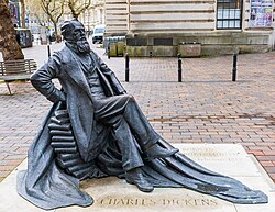 Museums and festivals celebrating Dickens's life and works exist in many places with which Dickens was associated. These include the Charles Dickens Museum in London, the historic home where he wrote Oliver Twist, The Pickwick Papers and Nicholas Nickleby; and the Charles Dickens Birthplace Museum in Portsmouth, the house in which he was born. The original manuscripts of many of his novels, as well as printers' proofs, first editions, and illustrations from the collection of Dickens's friend John Forster are held at the Victoria and Albert Museum.[247] Dickens's will stipulated that no memorial be erected in his honour; nonetheless, a life-size bronze statue of Dickens entitled Dickens and Little Nell, cast in 1890 by Francis Edwin Elwell, stands in Clark Park in the Spruce Hill neighbourhood of Philadelphia, Pennsylvania. Another life-size statue of Dickens is located at Centennial Park in Sydney, Australia.[248] In 1960 a bas-relief sculpture of Dickens, notably featuring characters from his books, was commissioned from sculptor Estcourt J Clack to adorn the office building built on the site of his former home at 1 Devonshire Terrace, London.[249] In 2014, a life-size statue was unveiled near his birthplace in Portsmouth on the 202nd anniversary of his birth; this was supported by his great-great-grandsons, Ian and Gerald Dickens.[250][251]