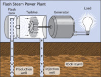 Generic geothermal power plant using hot water, with water pumped from deep underground under high pressure (1); water converts to steam when pressure drops at surface (2); steam spins a turbine connected to generator (3); steam cools off in cooling tower and becomes water (4); and cooled water pumped back into the earth.