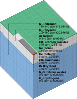 Visualization of composition by volume of Earth's atmosphere. Water vapor is not included, as this is highly variable. Each tiny cube (such as the one representing krypton) has one millionth of the volume of the entire block. Data is from NASA Langley.