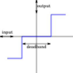 A deadband or dead-band (also known as a dead zone or a neutral zone) is a band of input values in the domain of a transfer function in a control system or signal processing system where the output is zero (the output is 'dead' - no action occurs). Deadband regions can be used in control systems such as servoamplifiers to prevent oscillation or repeated activation-deactivation cycles (called 'hunting' in proportional control systems). A form of deadband that occurs in mechanical systems, compound machines such as gear trains is backlash.
