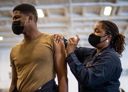 A US Navy hospital corpsman administers a flu shot aboard the USS Theodore Roosevelt(CVN-71) in 2020.