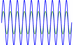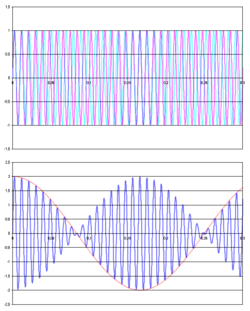 If the two original frequencies are quite close (for example, a difference of approximately twelve hertz),[4] the frequency of the cosine of the right side of the expression above, that is f1 − f2/2, is often too low to be perceived as an audible tone or pitch. Instead, it is perceived as a periodic variation in the amplitude of the first term in the expression above. It can be said that the lower frequency cosine term is an envelope for the higher frequency one, i.e. that its amplitude is modulated. The frequency of the modulation is f1 - f2/2, while the carrier or average frequency is f1 + f2/2. It can be noted that every second burst in the modulation pattern is inverted. Each peak is replaced by a trough and vice versa. However, because the human ear is not sensitive to the phase of a sound, only its amplitude or intensity, only the magnitude of the envelope is heard. Therefore, subjectively, the frequency of the envelope seems to have twice the frequency of the modulating cosine, which means the audible beat frequency is:[5]
