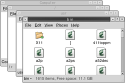 As in navigational file managers, when a directory is opened, the icon representing the directory changes—perhaps from an image showing a closed drawer to an opened one, perhaps the directory's icon turns into a silhouette filled with a pattern—and a new window is opened to represent that directory.