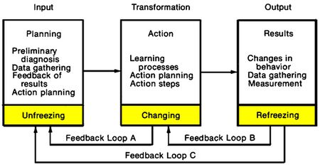 The third stage of action research is the output, or results, phase. This stage includes actual changes in behavior (if any) resulting from corrective action steps taken following the second stage. Data are again gathered from the client system so that progress can be determined and necessary adjustments in learning activities can be made. Minor adjustments of this nature can be made in learning activities via Feedback Loop B (see Figure 1). Major adjustments and reevaluations would return the OD project to the first, or planning, a stage for basic changes in the program. The action-research model shown in Figure 1 closely follows Lewin's repetitive cycle of planning, action, and measuring results. It also illustrates other aspects of Lewin's general model of change. As indicated in the diagram, the planning stage is a period of unfreezing, or problem awareness.[22] The action stage is a period of change, that is, trying out new forms of behavior in an effort to understand and cope with the system's problems. (There is inevitable overlap between the stages since the boundaries are not clear-cut and cannot be in a continuous process). The results stage is a period of refreezing, in which new behaviors are tried out on the job and, if successful and reinforcing, become a part of the system's repertoire of problem-solving behavior.