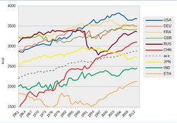 Since 1961, human diets across the world have become more diverse in the consumption of major commodity staple crops, with a corollary decline in consumption of local or regionally important crops, and thus have become more homogeneous globally.[113] The differences between the foods eaten in different countries were reduced by 68% between 1961 and 2009. The modern "global standard"[113] diet contains an increasingly large percentage of a relatively small number of major staple commodity crops, which have increased substantially in the share of the total food energy (calories), protein, fat, and food weight that they provide to the world's human population, including wheat, rice, sugar, maize, soybean (by +284%[114]), palm oil (by +173%[114]), and sunflower (by +246%[114]). Whereas nations used to consume greater proportions of locally or regionally important crops, wheat has become a staple in over 97% of countries, with the other global staples showing similar dominance worldwide. Other crops have declined sharply over the same period, including rye, yam, sweet potato (by −45%[114]), cassava (by −38%[114]), coconut, sorghum (by −52%[114]) and millets (by −45%[114]).[113][114][115] Such crop diversity change in the human diet is associated with mixed effects on food security, improving under-nutrition in some regions but contributing to the diet-related diseases caused by over-consumption of macronutrients.[113]