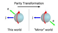 The reason for this is that the cobalt-60 nucleus carries spin, and spin does not change direction under parity (because angular momentum is an axial vector). Conversely, the direction in which the decay products are emitted is changed under parity because momentum is a polar vector. In other words, in the "real" world, if the cobalt-60 nuclear spin and the decay product emissions were both in roughly the same direction, then in the "mirror" world, they would be in roughly opposite directions, because the emission direction would have been flipped, but the spin direction would not.[13]