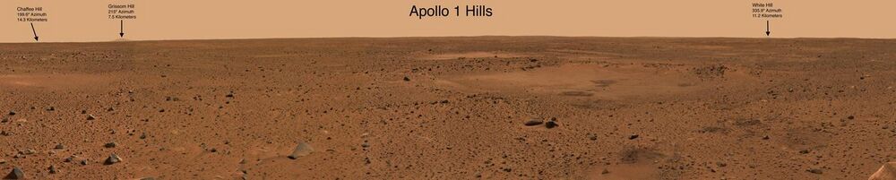 The Apollo 1 Hills are three hills on Mars named to memorialize the crew of Apollo 1. The three hills were some of the first landmarks sighted following the January 7, 2004, landing of the Spirit rover on Mars.