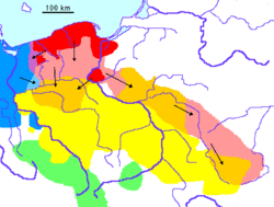 By the third century, Late Proto-Germanic speakers had expanded over significant distance, from the Rhine to the Dniepr spanning about 1,200 km (700 mi). The period marks the breakup of Late Proto-Germanic and the beginning of the (historiographically recorded) Germanic migrations.