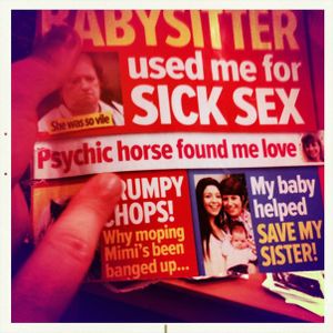 Tabloid-like behaviour is often associated with weekly glossy magazines. Originally, the glossy tabloid market was dominated by OK! and Hello! - which famously pay out fuckloads of cash for wedding photographs. Now they have since been joined by the likes of Love It! and Heat!, which now battle it out to see how low down the list of fame and importance they can drag up their cover-story celebrities from, how many weeks in a row they can feature the same person without anyone noticing and how inane they can make the Agony Aunt columns. Usually such magazines feature "stories about real people and celebrities", which sort of implies that vaguely famous people aren't actually real (if you want to play a fun semantics game).