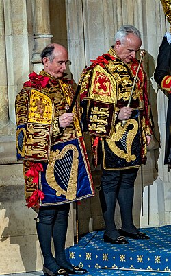 However, two kings of arms and two or four heralds of arms have figured during royal inauguration ceremonies. These were usually members of the High Council of Nobility. During the inaugurations of Wilhelmina and Juliana, the kings of arms wore nineteenth-century-style court dress, whereas the heralds wore tabards. All officers carried rods and wore chains of office.[5] In the inauguration of Queen Beatrix in 1980, members of the resistance posed as the ceremonial officers of arms, with Erik Hazelhoff Roelfzema being the elder king of arms.[6] Like most other participants in the pageant, the officers of arms were no longer wearing ceremonial dress, but white tie instead. The senior king of arms proclaims the king or queen to be inaugurated after he or she has sworn allegiance to the constitution. The heralds step outside the New Church in Amsterdam, where the inauguration ceremony is held, to announce this fact to the people gathered outside the church.[7]