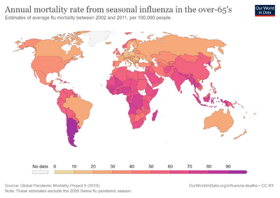 The cost-effectiveness of seasonal influenza vaccination has been widely evaluated for different groups and in different settings.[206] In the elderly (aged over 65 years) the majority of published studies have found that vaccination is cost saving, with the cost savings associated with influenza vaccination (e.g. prevented healthcare visits) outweighing the cost of vaccination.[207] In older adults (aged 50–64 years), several published studies have found that influenza vaccination is likely to be cost-effective, however the results of these studies were often found to be dependent on key assumptions used in the economic evaluations.[208] The uncertainty in influenza cost-effectiveness models can partially be explained by the complexities involved in estimating the disease burden,[209] as well as the seasonal variability in the circulating strains and the match of the vaccine.[210][211] In healthy working adults (aged 18–49 years), a 2012 review found that vaccination was generally not cost-saving, with the suitability for funding being dependent on the willingness to pay to obtain the associated health benefits.[212] In children, the majority of studies have found that influenza vaccination was cost-effective, however many of the studies included (indirect) productivity gains, which may not be given the same weight in all settings.[213] Several studies have attempted to predict the cost-effectiveness of interventions (including prepandemic vaccination) to help protect against a future pandemic, however estimating the cost-effectiveness has been complicated by uncertainty as to the severity of a potential future pandemic and the efficacy of measures against it.[214]