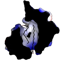 Oryza sativa Lipid Transfer Protein 1 bound to palmitic acid (black). Positive charge in blue; negative charge in red (PDB: 1UVB). |