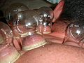 Cupping is a pre-modern "medical" practice, consisting of sticking cups to the patient's skin via suction with the idea to make them better. Documentary evidence exists that the practice was widespread in Egypt as far back as 1550 BCE.[1] The ancient Greeks also practiced cupping; Hippocrates was credited with using the practice in 400 BCE.[2] As no ancient medical treatment is stale enough for alternative medicine fans, it is still practised (in Unani, traditional Chinese medicine, and Ayurveda, among other things), commonly under the guise of "detoxification". There is absolutely no evidence that cupping has any positive effect on one's health and may actually be harmful, with the possibility of blood vessels rupturing from the pressure and burns if fire is used. It also has the possible side effect of making the patient look like a moron.