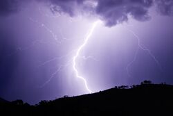 Lightning is a dramatic natural example of static discharge. While the details are unclear and remain a subject of debate, the initial charge separation is thought to be associated with contact between ice particles within storm clouds. In general, significant charge accumulations can only persist in regions of low electrical conductivity (very few charges free to move in the surroundings), hence the flow of neutralizing charges often results from neutral atoms and molecules in the air being torn apart to form separate positive and negative charges, which travel in opposite directions as an electric current, neutralizing the original accumulation of charge. The static charge in air typically breaks down in this way at around 10,000 volts per centimeter (10 kV/cm) depending on humidity.[9] The discharge superheats the surrounding air causing the bright flash, and produces a shock wave causing the booming sound. A lightning bolt is simply a scaled-up version of the sparks seen in more domestic occurrences of static discharge. The flash occurs because the air in the discharge channel is heated to such a high temperature that it emits light by incandescence. The clap of thunder is the result of the shock wave created as the superheated air expands.