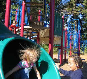 Electrons or ions can be exchanged between materials on contact or when they slide against each other, which is known as the triboelectric effect and results in one material becoming positively charged and the other negatively charged. The triboelectric effect is the main cause of static electricity as observed in everyday life, and in common high-school science demonstrations involves rubbing different materials together (e.g., fur against an acrylic rod). Contact-induced charge separation causes your hair to stand up and causes "static cling" (for example, a balloon rubbed against the hair becomes negatively charged; when near a wall, the charged balloon is attracted to positively charged particles in the wall, and can "cling" to it, suspended against gravity).