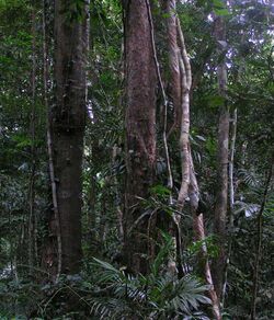 Since trees can grow larger than other plant life-forms, there is the potential for a wide variety of forest structures (or physiognomies). The infinite number of possible spatial arrangements of trees of varying size and species makes for a highly intricate and diverse micro-environment in which environmental variables such as solar radiation, temperature, relative humidity, and wind speed can vary considerably over large and small distances. In addition, an important proportion of a forest ecosystem's biomass is often underground, where soil structure, water quality and quantity, and levels of various soil nutrients can vary greatly.[6] Thus, forests are often highly heterogeneous environments compared to other terrestrial plant communities. This heterogeneity in turn can enable great biodiversity of species of both plants and animals. Some structures, such as tree ferns may be keystone species for a diverse range of other species.[7]