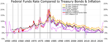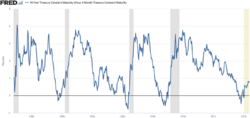 The slope of the yield curve is one of the most powerful predictors of future economic growth, inflation, and recessions.[83] One measure of the yield curve slope (i.e. the difference between 10-year Treasury bond rate and the 3-month Treasury bond rate) is included in the Financial Stress Index published by the St. Louis Fed.[84] A different measure of the slope (i.e. the difference between 10-year Treasury bond rates and the federal funds rate) is incorporated into the Index of Leading Economic Indicators published by The Conference Board.[85]