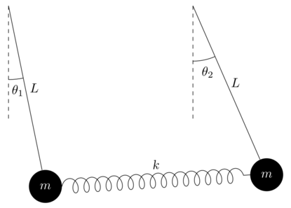 The Lagrangian is then [math]\displaystyle{ \mathcal{L}=\frac{1}{2}mL^2\left(\dot\theta_1^2+\dot\theta_2^2\right)-mgL(2-\cos\theta_1-\cos\theta_2)-\frac{1}{2} k L^2(\theta_2-\theta_1)^2 }[/math] which leads to the following set of coupled differential equations: [math]\displaystyle{ \begin{align} \ddot\theta_1+\frac{g}{L}\sin\theta_1+\frac{k}{m}(\theta_1-\theta_2)&=0 \\ \ddot\theta_2+\frac{g}{L}\sin\theta_2-\frac{k}{m}(\theta_1-\theta_2)&=0 \end{align} }[/math]