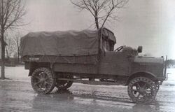 After the introduction of Tatra 11 and Tatra 12 cars with their distinctive backbone tube design and swing axles, Tatra introduced its first truck on the same basis,[30] the light utility Tatra 13 powered by 2-cylinder air-cooled petrol engine with power output 8.8 kW (12 hp) and 1,000 kg (2,205 lb) cargo capacity. Further models followed, and in 1926, T23 and T24 were introduced, nicknamed "bulldogs", which could be considered Tatra's precursors to COE designed trucks. Improved version T13 was introduced as T26 with a more powerful 4-cylinder flat air-cooled engine and in six-wheeler chassis created capable offroad light utility truck which later evolved into T72 model which was heavily used by Czechoslovakian army at the time and was also manufactured under license by the French company Lorraine-Dietrich. In 1933 Tatra built a limited series of T25 heavy artillery hauler with 4 and 6-cylinder petrol engines. The most popular Tatra truck before World War II was type T27 powered by 4-cylinder petrol or diesel engines, which remained in production for nearly 17 years (1930–1947) with total production of 7,620 units.[31] By adding an extra axle to the rear the type T28 was created; however, it was not successful and only limited production resulted in a mainly bus chassis. In the period from 1931 to 1938 Tatra also built a small utility truck based on the chassis from T30 named Tatra T43 which remain popular with small business owners. T72 model successfully continued the line to T82 built mainly for military in cargo and personnel transport between 1935 and 1938 and further to T92 and T93 built for the Romanian army from 1938 to 1941 which were identical except T93 had also a driven front axle.[32]