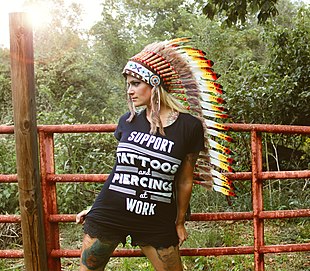 A common example of cultural appropriation is the adoption of the iconography of another culture, and using it for purposes that are unintended by the original culture or even offensive to that culture's mores. Examples include sports teams using Native American tribal names or images as mascots; people not from the originating culture wearing jewelry or fashion that incorporates religious symbols such as the medicine wheel, or wearing items of deep cultural significance and status that must be earned, such as a war bonnet, without having earned the right.[43] Authentic Native American war bonnets are sacred, ceremonial items, earned by people of high status in a traditional, tribal society – much like military medals. People from cultures who have this sacred regalia usually consider it disrespectful and offensive when someone who has not earned the right to wear one dons an authentic or imitation headdress – whether as part of pretending to be Native American, or as a costume or fashion statement.[43][44]Copying iconography from another culture's history such as Polynesian tribal tattoos, Chinese characters, or Celtic art worn without regard to their original cultural significance may also be considered appropriation. Critics of the practice of cultural appropriation contend that divorcing this iconography from its cultural context or treating it as kitsch risks offending people who venerate and wish to preserve their cultural traditions.[45][46]