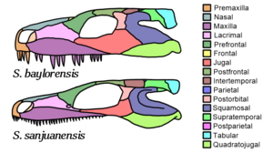 Some authors have argued that the postparietals of S. baylorensis were smaller than those of S. sanjuanensis, but some specimens of S. sanjuanensis (for example, the "Tambach lovers") also had small postparietals. In addition, the "Tambach lovers" have a quadratojugal bone which is more similar to that of S. baylorensis rather than S. sanjuanensis. The combination of features from both species in these specimens may indicate that the two species are part of a continuous lineage, rather than two strongly differentiated evolutionary paths. Likewise, some differences relating to the proportions of the rear of the skull may be considered to be an artifact of the fact that most S. sanjuanensis specimens were not fully grown prior to the discovery of the "Tambach lovers", which were adult members of the species.[8]