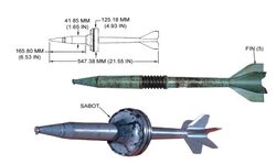 Sabots certainly use driving bands and obturators, because the same manufacturing tolerance issues exist when sealing the saboted projectile in the barrel, but the sabot itself is a more substantial structural component of the in-bore projectile configuration (Drysdale 1978).[1] Refer to the two APFSDS (armor-piercing fin-stabilized discarding sabot) pictures on the right to see the substantial material nature of a sabot to fill the bore diameter around the sub-caliber arrow-type flight projectile, compared to the very small gap sealed by a driving band or obturator to mitigate what is known classically as windage. More detailed cutaways of the internal structural complexity of advanced APFSDS saboted long rod penetrator projectiles can be found at reference 2.[2]