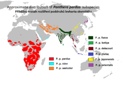 ↑ 90.090.190.290.390.4Sunquist, M. E.; Sunquist, F. (2002). "Leopard Panthera pardus". Wild Cats of the World. Chicago: University of Chicago Press. pp. 318–342. ISBN 978-0-226-77999-7. https://books.google.com/books?id=IF8nDwAAQBAJ&pg=PA320.