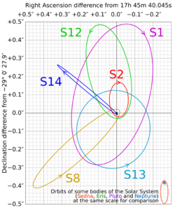 The radius of the central object must be less than 17 light-hours, because otherwise S2 would collide with it. Observations of the star S14[85] indicate that the radius is no more than 6.25 light-hours, about the diameter of Uranus' orbit.