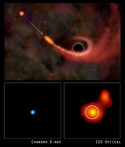 Artist's impression of a supermassive black hole tearing apart a star. Below: supermassive black hole devouring a star in galaxy RX J1242−11 – X-ray (left) and optical (right).[88]