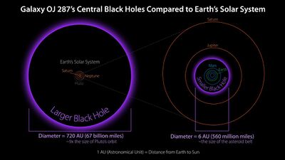 Comparisons of large and small black holes in galaxy OJ 287 to the Solar System