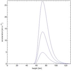 However, when the air density cannot be assumed to be constant, such as for objects falling from high altitude, the equation of motion becomes much more difficult to solve analytically and a numerical simulation of the motion is usually necessary. The figure shows the forces acting on small meteoroids falling through the Earth's upper atmosphere (an acceleration of 0.1 km/s² is 10 g0). HALO jumps, including Joe Kittinger's and Felix Baumgartner's record jumps, also belong in this category.[9]