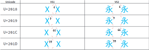 | base + VS01 | ‘︀ | ’︀ | “︀ | ”︀ | non-fullwidth form |