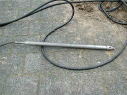 The standard approach to moling is to dig a hole about 1 m square and 2 m deep. Such a hole is small enough that it can be dug by hand instead of by machine in inaccessible locations. The mole is then entered into the earth on the horizontal face at the bottom of this hole. A destination hole of similar proportions is also dug, and this is where the mole emerges. The mole itself is a steel cylinder about 60 cm long and 6 cm in diameter. It works as a pneumatic cylinder with pulsed compressed air causing the head of the mole to repeatedly hammer against the soil in front of the mole. Once the mole has passed through the earth the pipe can be pulled through the long horizontal hole.
