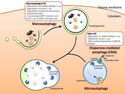 Autophagy is cytoplasmic, characterized by the formation of large vacuoles that eat away organelles in a specific sequence prior to the destruction of the nucleus.[5] Macroautophagy, often referred to as autophagy, is a catabolic process that results in the autophagosomic-lysosomal degradation of bulk cytoplasmic contents, abnormal protein aggregates, and excess or damaged organelles. Autophagy is generally activated by conditions of nutrient deprivation but has also been associated with physiological as well as pathological processes such as development, differentiation, neurodegenerative diseases, stress, infection and cancer.