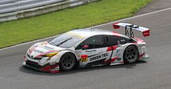 A racing version of the Prius was unveiled by Toyota in 2013. This racing Prius replaces the 1.8-litre Atkinson-cycle engine with a 3.4-litre V8 RV8KLM engine which is mid-mounted in the car (the engine was later moved to the front in 2019 due to GT300 regulation changes). The hybrid drive train of the car's production Hybrid Synergy Drive is retained but with a larger lithium ion battery.[225] The RV8KLM is in fact the same engine featured in multiple Le Mans Prototypes such as the Lola B12/60 and Rebellion R-One. The car took class pole position[226] and finished sixth at the 2012 Fuji GT 500km.[227]