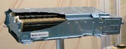 The Second Generation Prius contains a 1.310 kWh battery, composed of 28 modules. Each battery module is made of six individual 1.2 V 6.5 Ah Prismatic NiMH cells in series forming a 7.2 V 6.5 Ah module with 46 Wh/kg energy density and 1.3 kW/kg output power density.[177] Each module contains an integrated charge controller and relay. These modules are connected 28 in series to form a 201.6 V 6.5 Ah battery (traction battery), also known as the energy storage system. The computer-controlled charge controller and battery management computer systems keep this battery between 38% and 82% state of charge, with a tendency to keep the average state of charge around 60%. By shallow cycling the battery, only a small portion of its net available energy storage capacity is available for use (approximately 400 Wh) by the hybrid drive system, but the shallow computer-controlled cycling dramatically improves the cycle life, thermal management control, and net long term calendar life of the battery. Active cooling of this battery is achieved by a blower motor and air ducting, while passive thermal management was accomplished through the metal case design.