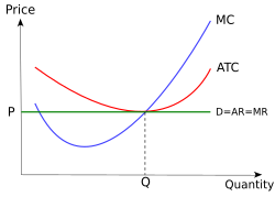 In the basic model there is a perfectly horizontal demand (D) curve, meaning that consumer demand is perfectly elastic. The demand curve can also be thought of as the marginal revenue curve. Any firm that tried to raise price will immediately begin to lose consumers because they can immediately get the same product from another firm. There is a marginal cost (MC) curve sloping upwards to the right, representing increasing costs. The marginal cost curve can be thought of as the firm's supply curve. The firm's output is determined by where the MC curve and demand curve intersect. There is a third curve, representing average total cost (ATC). The gap between the point at which the MC curve and demand curve intersect and the ATC is the profit margin. That profit margin is multiplied by the total quantity produced to estimate total profit. The existence of economic profit is considered abnormal in the perfectly competitive market, because of how easy it is for new firms to enter the market. Over time the demand curve will fall to where the ATC and MC are both equal to demand as new competitors increase supply and bring down the price.