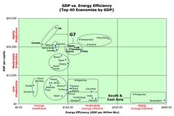 It is not directly causal that a high GDP per capita must have lower economic energy efficiencies. See the accompanying chart for examples based on the top 40 national economies.
