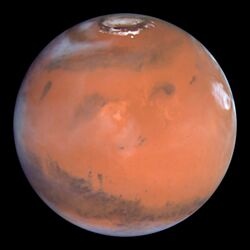 Hubble view of Mars: Gale crater can be seen. Slightly left and south of center, it is a small dark spot with dust trailing southward from it.