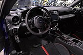 The BRZ's name comes from three elements: Boxer engine, rear-wheel drive, and Z standing for Zenith.[70][71] The Subaru BRZ differs from the 86's design in the front fascia, with a different grille and headlight assembly, as well as a different front fender vent. The BRZ's grill is hexagonal in shape, compared to the Toyota's trapezoid. The BRZ features a wraparound of LED parking lights in the headlight assembly, while daytime running lights are integrated into the bumper. The suspension setup of the Subaru is different from the Toyota.[72] Like the Japanese Toyota 86, Subaru offers an RA base model lacking most interior comforts and using 16 inch steel wheels, with the only difference from the 86 RC being that the BRZ RA's bumpers are painted the same colour as the body. Two main trim levels are offered: R trim, known as Premium in North America, and S trim, known as Limited in North America. The most notable differences between the trims being the S trim (Limited) received leather seats with Alcantara inserts that were heated rather than the cloth seats in the R trim (Premium). In Europe and Australia BRZs offer a Toyota stereo unit, while Japanese and North American vehicles use a Subaru unit. Australian BRZs were originally available for sale only online.