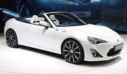 The FT-86 Open concept is a convertible concept vehicle based on the Toyota 86. It includes an electrically operated multi-layered fabric roof with glass, high-contrast white and navy blue interior and exterior designed by Toyota Boshoku Milan Design (TBMD) to capture the spirit and atmosphere of Milan, a white body colour and yellow-gold stitching in the floor mats and seats. It was first shown at the Geneva Motor Show in March 2013,[95][96] followed by the 2013 Tokyo Motor Show (with Flash Red body colour and electrically operated soft top).[97][98]