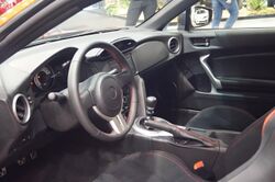 The interior uses low mounted front seats and fold down rear enabling increased storage space.[36] The FR-S and base 86 models have cloth seats with all black interior trim with a black patterned dash trim, and shift boot red stitching. The BRZ has two available interiors, one identical to the FR-S but with silver dash trim, a red stitched parking brake boot, black gauge faces (instead of the white tachometer of the 86 GTS models) and a touch-screen navigation head unit; the second interior to leather and Alcantara heated seats, automatic HVAC controls, and a push-button start. The top-of-the-range 86 models are fitted like the BRZ except as noted above, and the Japanese interior can be had in black/red leather and Alcantara or full black leather and Alcantara.